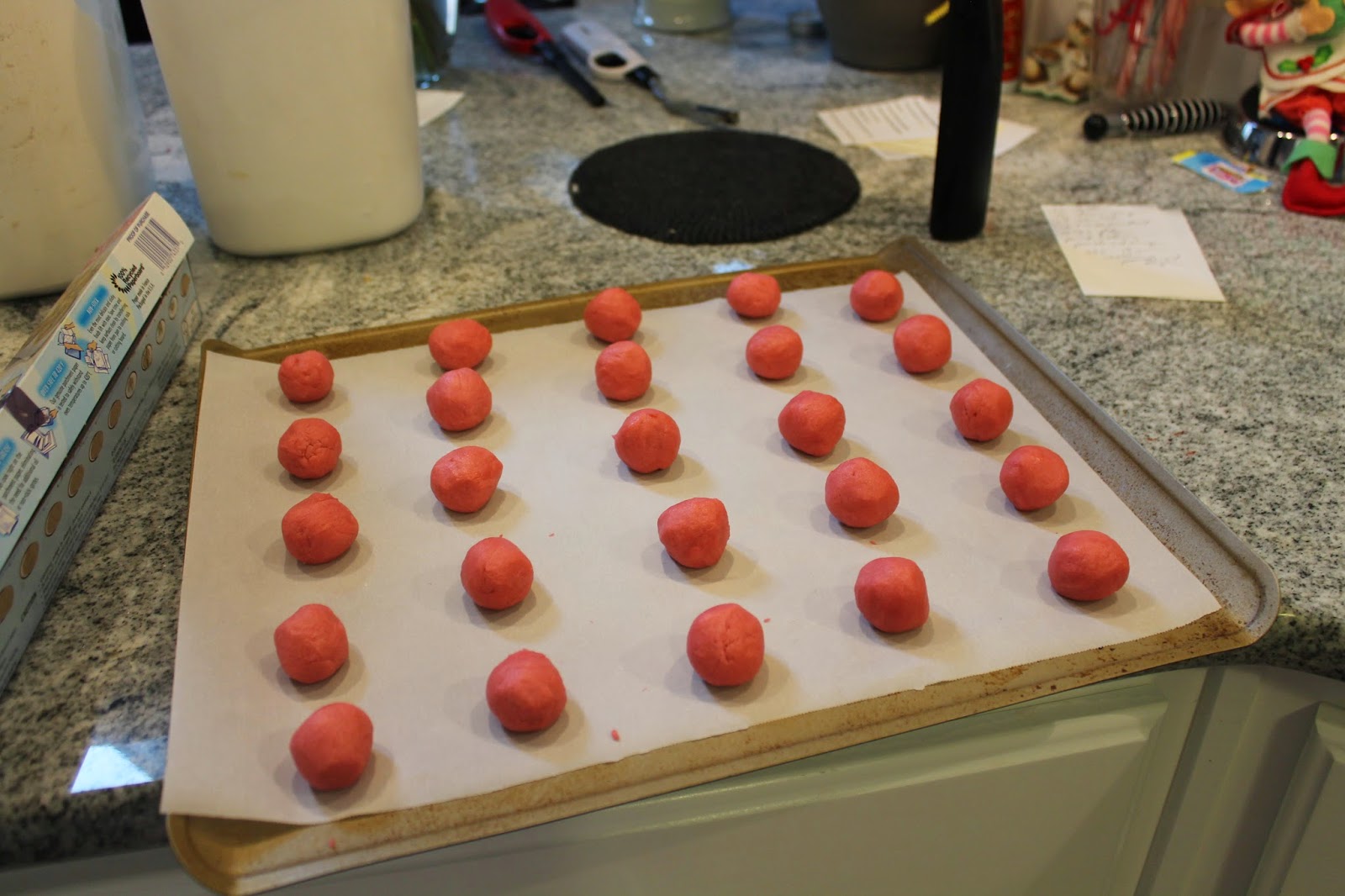 Roll into small balls. I think here is where I should have put them in the fridge for a couple of minutes or hours. Place in a preheated 350 oven and bake for about 15 minutes.