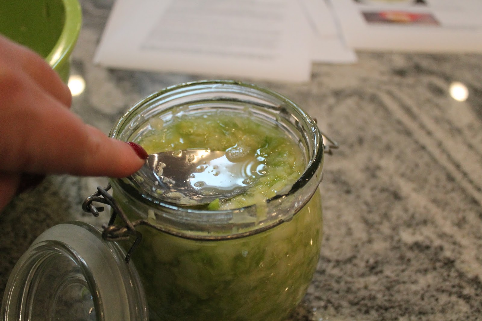 This is after two week. At the two week mark you only have to open them once a day. You can see it is becoming more like kraut. Still leave it on the counter.